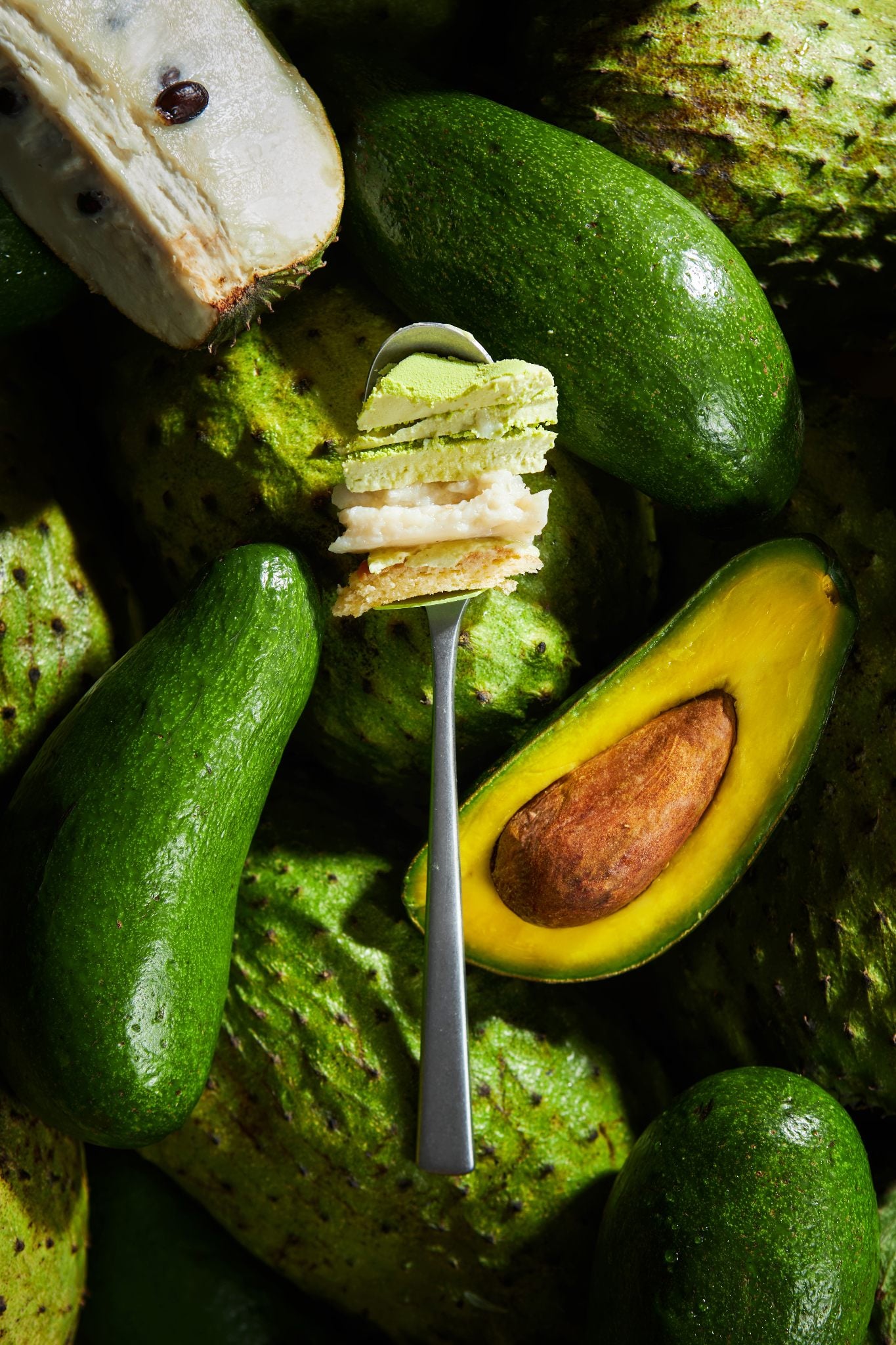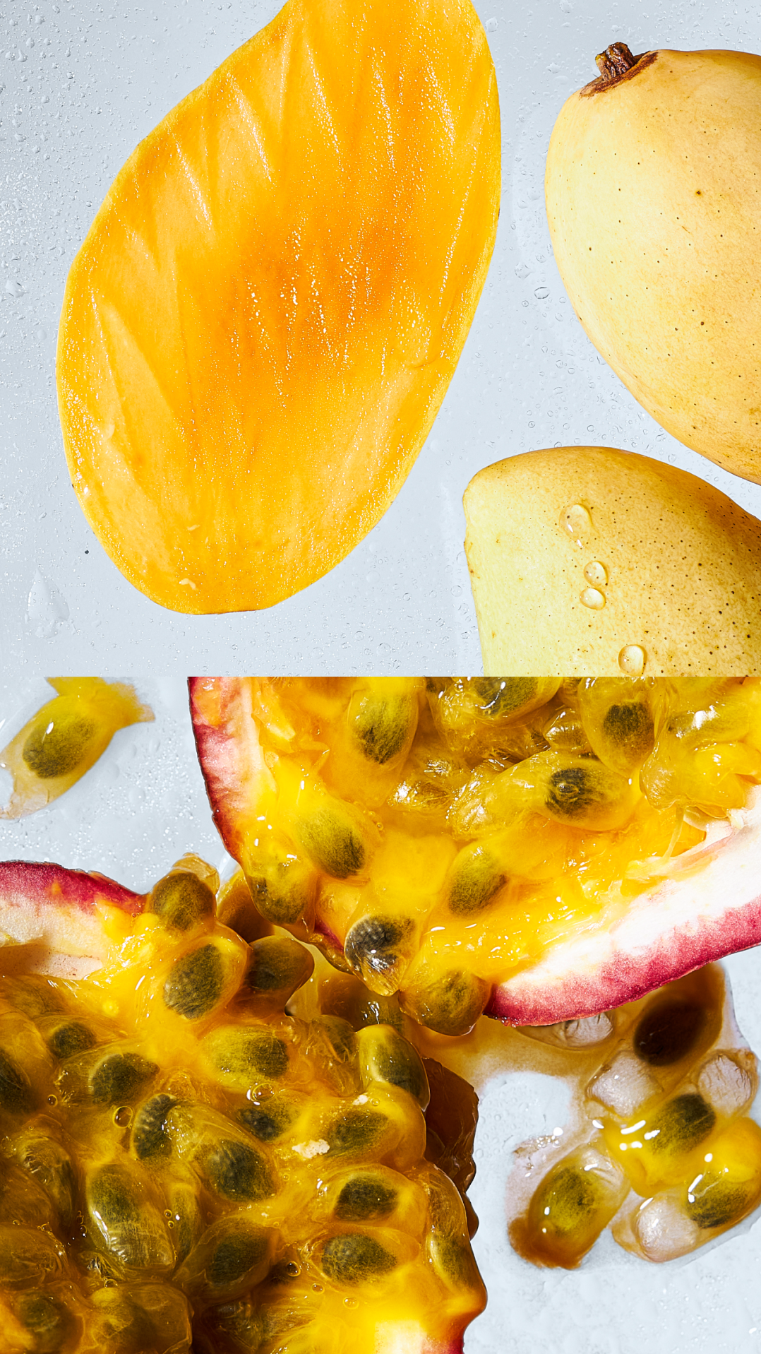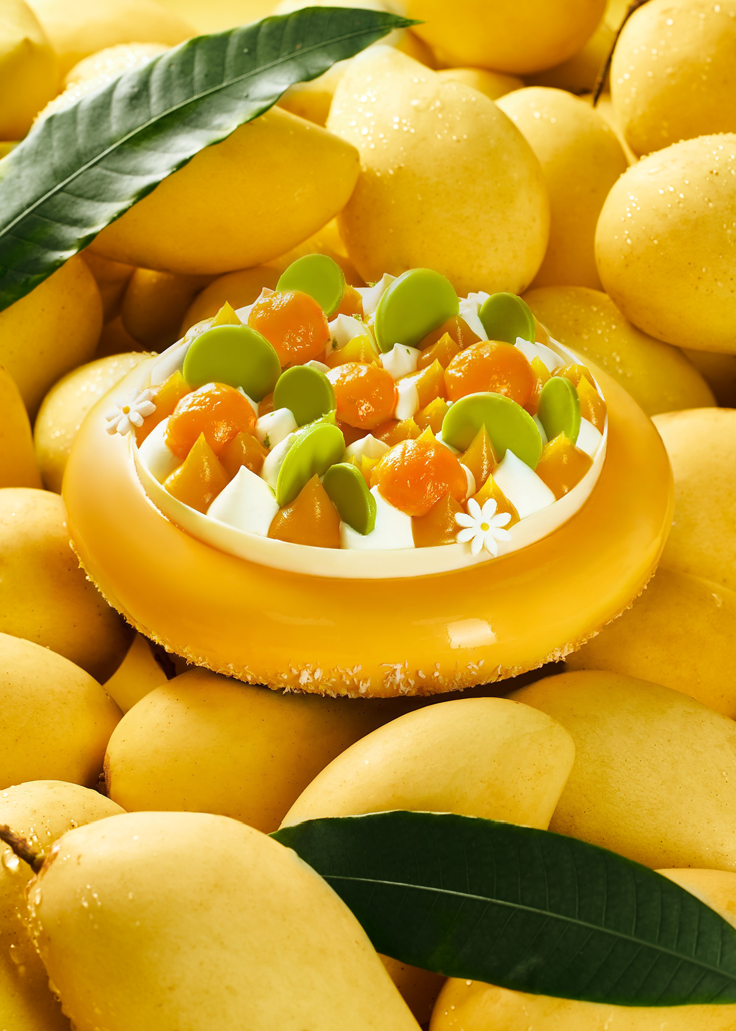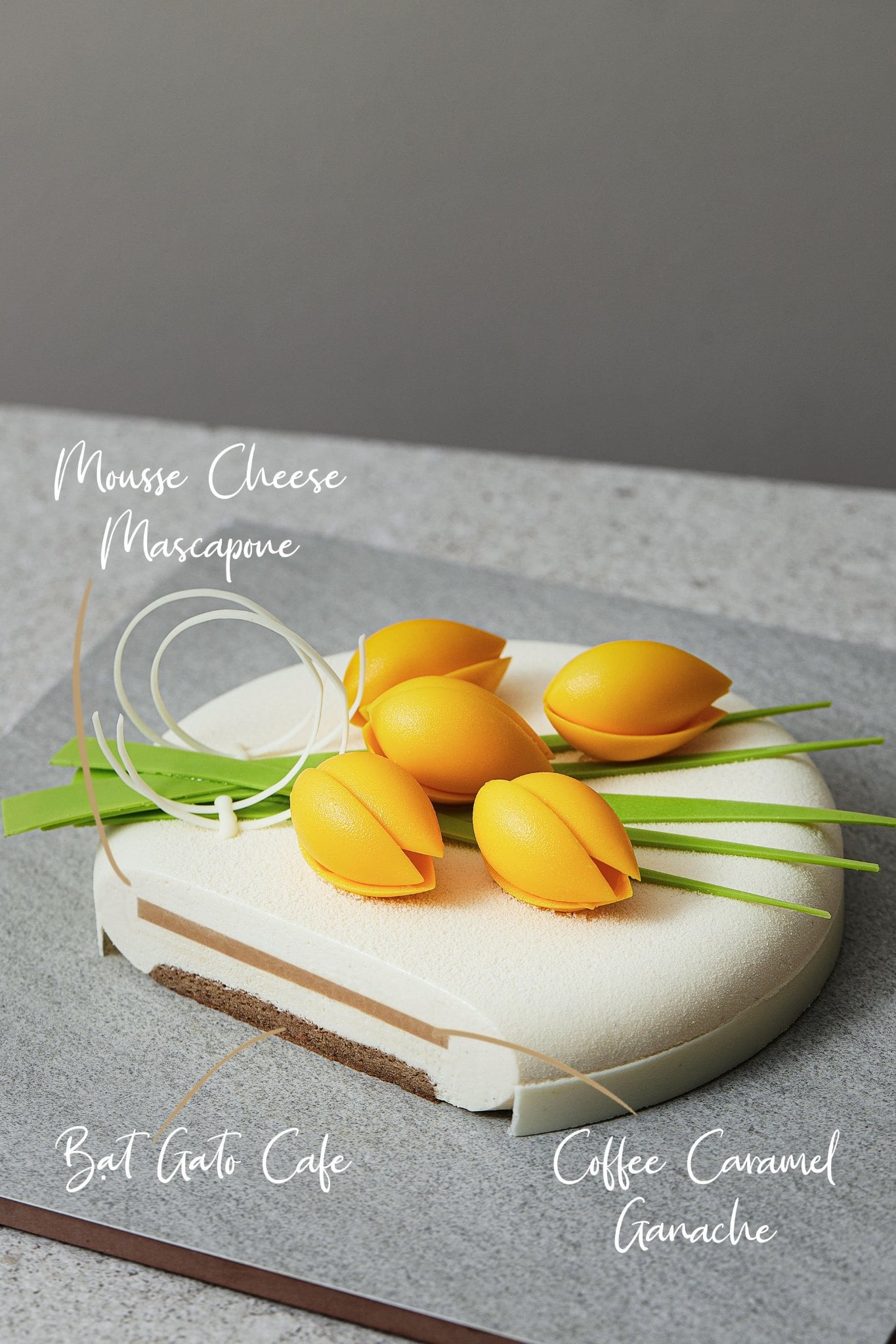 Chiếc bánh là bản hòa ca của trái cây nhiệt đới và phô mai ngậy béo. Lớp mousse cheese mềm tan kết hợp ba tầng nhân: jelly xoài mọng nước, lớp passion cremeux đậm đà, và jelly chanh leo tươi mát. Từng muỗng bánh như cắn vào ánh nắng vàng rực rỡ, chua ngọt đầy sức sống.
