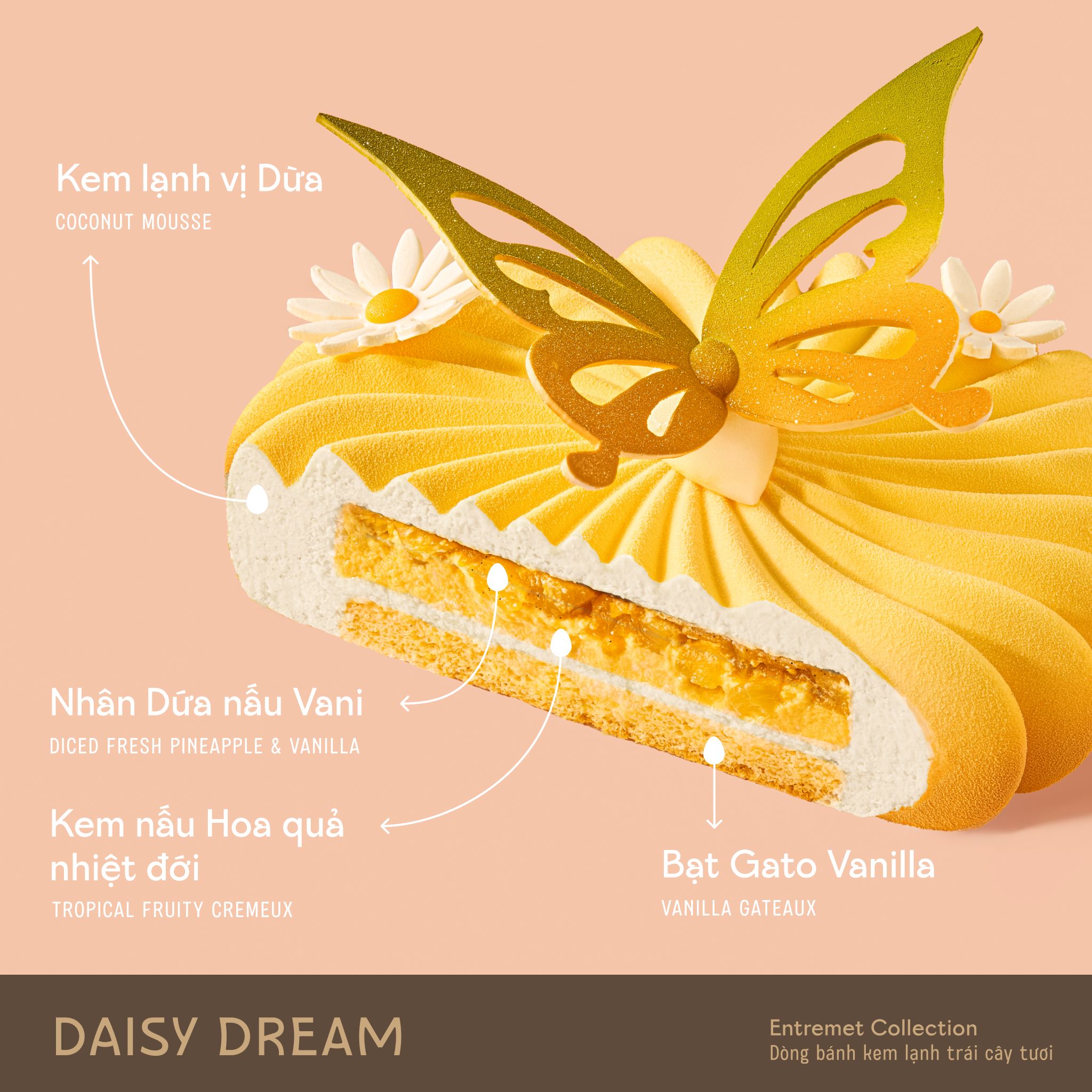 Là dòng bánh mousse Dừa nhân Dứa.Vị bánh nghiêng về vị nhân Dứa nấu cùng Vani, thơm và bùi từ lớp kem Dừa. Lúc ăn sẽ cảm nhận độ giòn của Dứa và mềm mượt bởi lớp kem Dừa