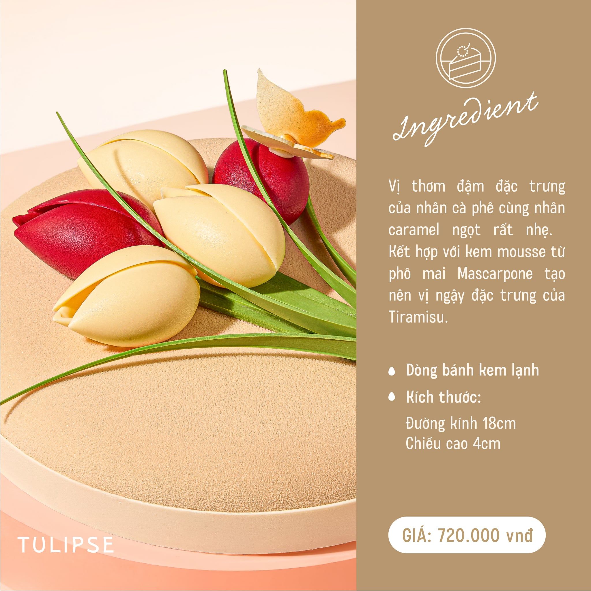 Bánh có độ ngọt thấp, thơm nhẹ mùi Cà Phê & Caramel, đế bánh là lớp bạt mềm vị cà phê để cân bằng độ ngậy.