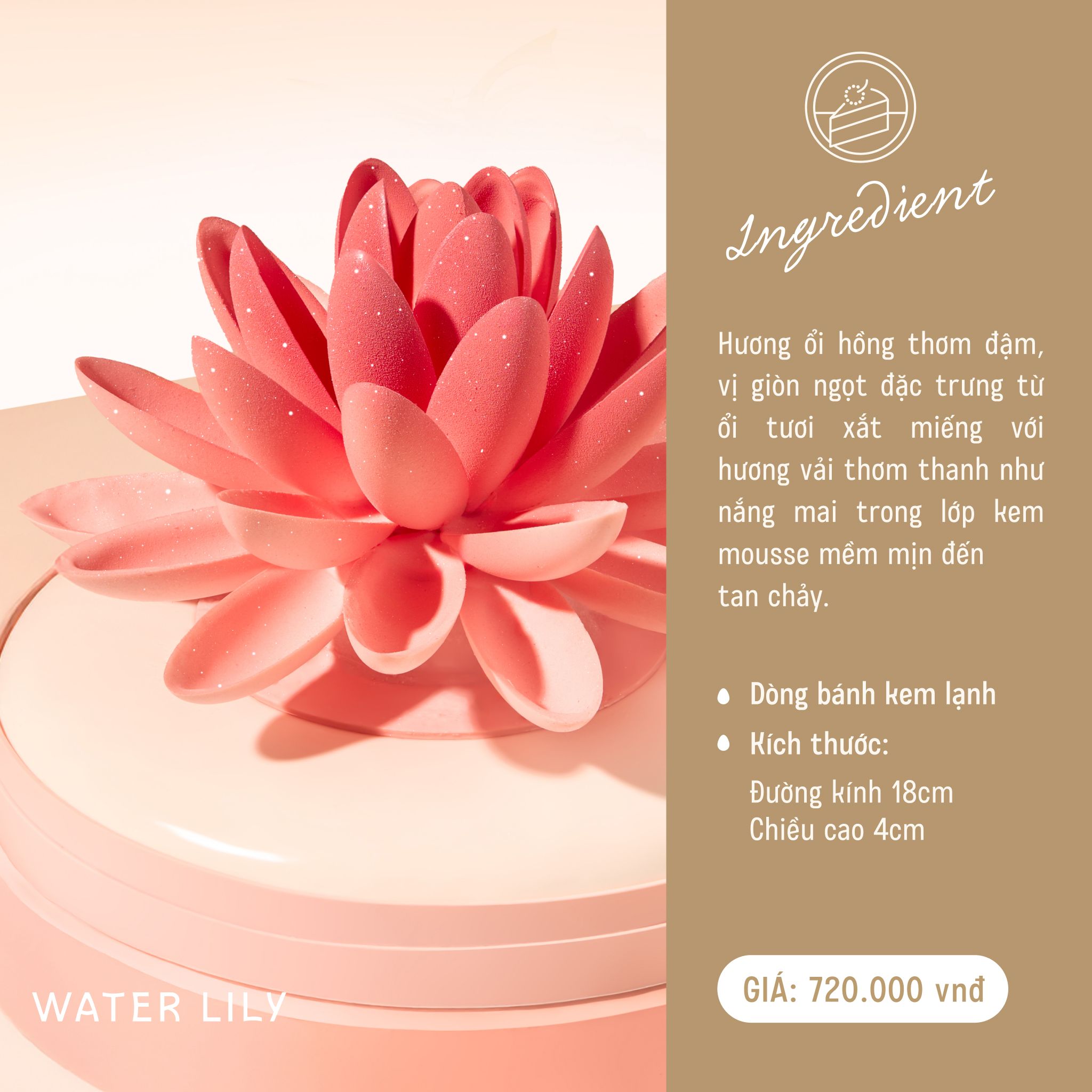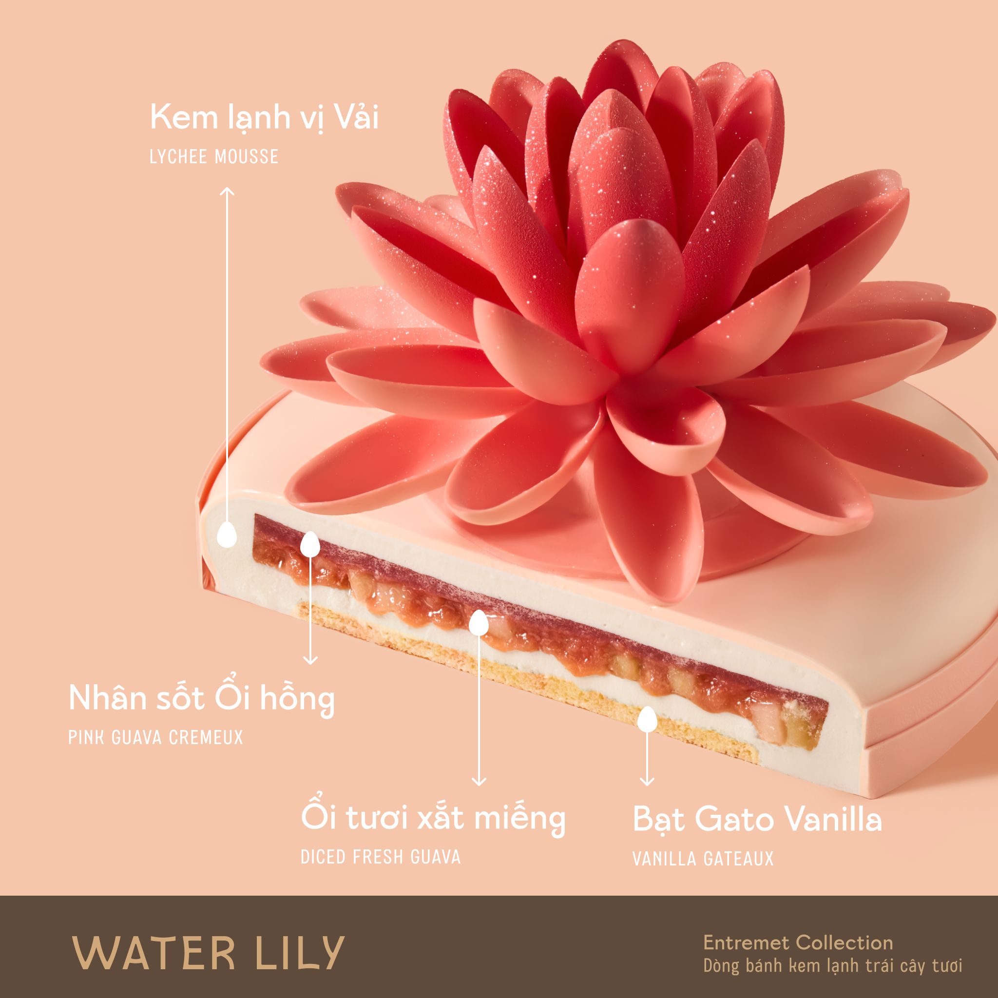 Nốt hương thanh tao đầy mới lạ của Ổi Hồng vùng miệt vườn nhiệt đới. Phần nhân Ổi Hồng đậm vị và ổi tươi xắt miếng giòn giòn nịnh miệng, kết hợp với phần kem mousse vị Vải thơm thanh cùng lớp đế bạt gato Vani bông mềm